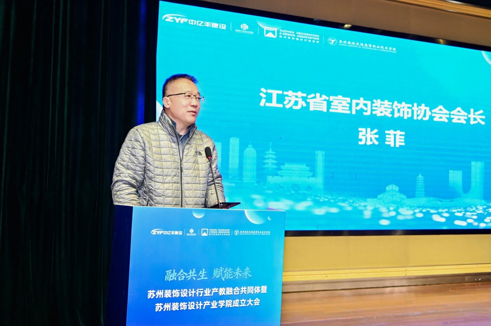 2025年11月21日,在江苏省室内装饰协会的指导下,苏州装饰设计行业产教融合共同体暨苏州装饰设计产业学院成立大会于苏州建设交通高等职业技术学校成功举行。江苏省室内装饰协会会长张菲受邀莅临大会并参与了共同体的揭牌仪式。